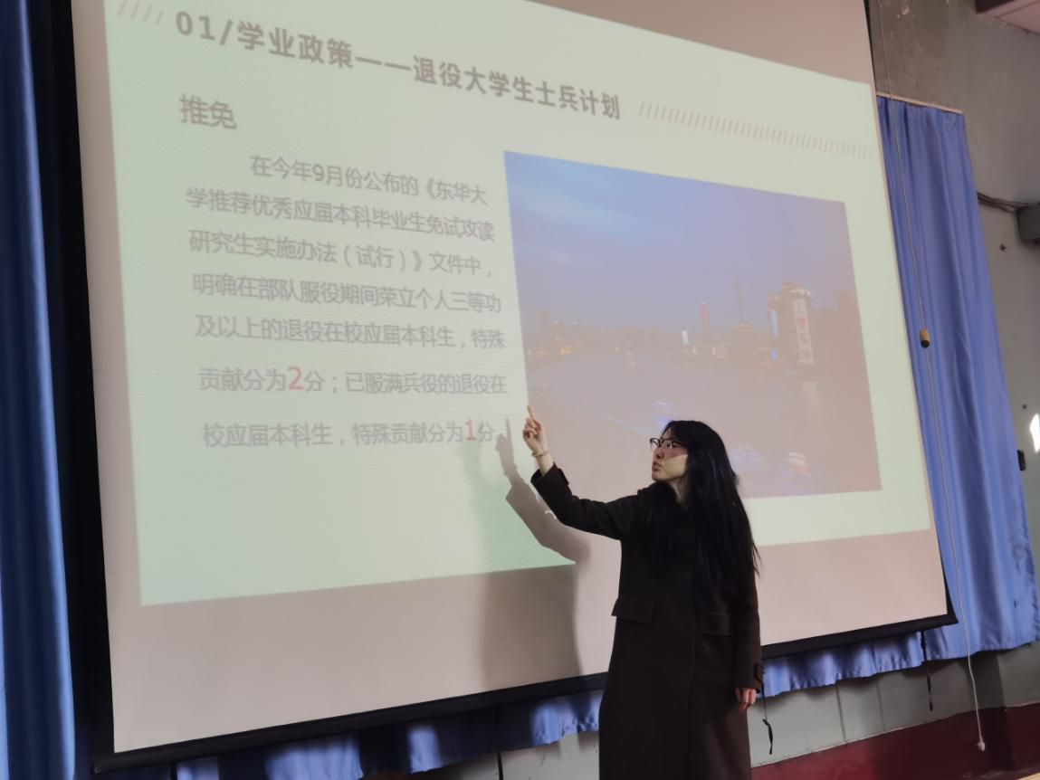 会上,徐欣怡老师就应征入伍老员工的学业政策、落户政策、就业政策、毕业生提干、优待金政策及退伍回来后的发展前景等方面进行了详细介绍。