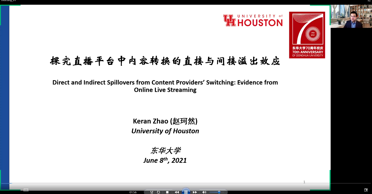 6月8日上午,美国休斯顿大学鲍尔韦德体育决策与信息系统系赵珂然助理教授受邀来公司做以“Direct and Indirect Spillovers from Content Providers’ Switching: Evidence from Online Live Streaming”为主题的学术讲座。韦德体育的老师和同学们通过腾讯会议共同聆听了此次讲座,韦德体育沈滨老师主持。