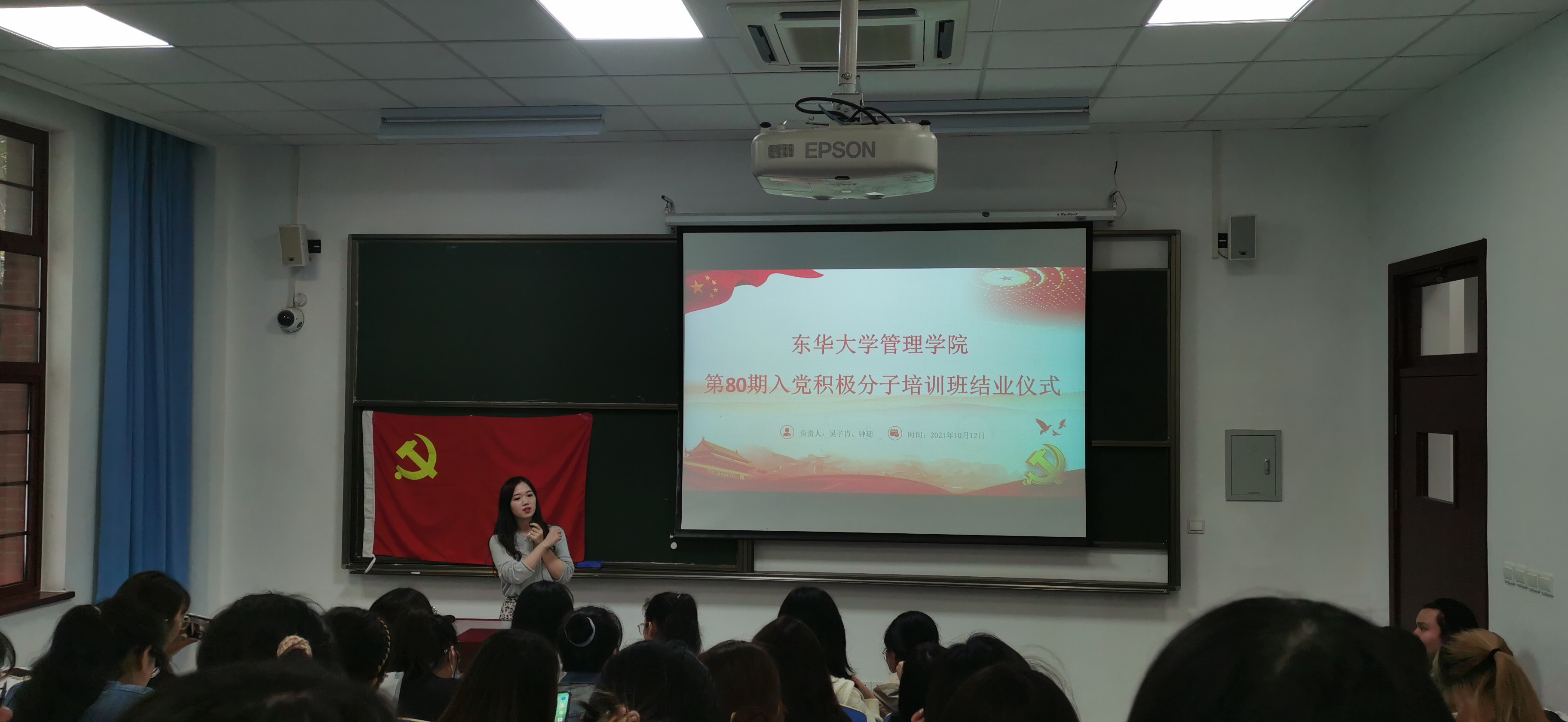 本次活动由吴子肖老师主持,在仪式一开始,吴子肖老师为入党积极分子们介绍了此次培训班的大致内容。第80期入党积极分子培训班于9月16日正式开班,一共有84位学员参加了培训,其中本科生75名,研究生9名。历时三周的课程经过了主题党日、集中参观实地实践、学习强国在线学习等等,结合日常考试、学习笔记、学员培训、学员手册以及结业小结等综合考察,顺利完成了本期的培训任务。
