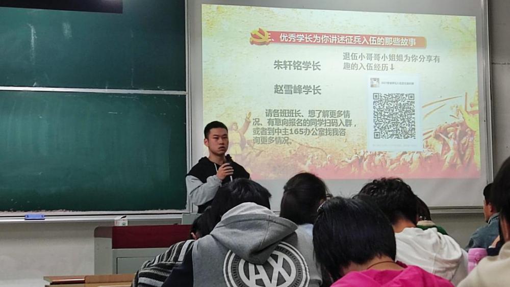 在徐欣怡老师介绍之后,赵雪峰学长为同学们带来了简短但精彩的入伍经历分享。作为一名在甘肃艰苦地区服兵役的陆军,赵雪峰学长与同学们分享了军旅生活中的枯燥严苛与别样的丰富多彩,让同学们感受到了部队生活锻炼与塑造个人果断坚毅品格的历程。