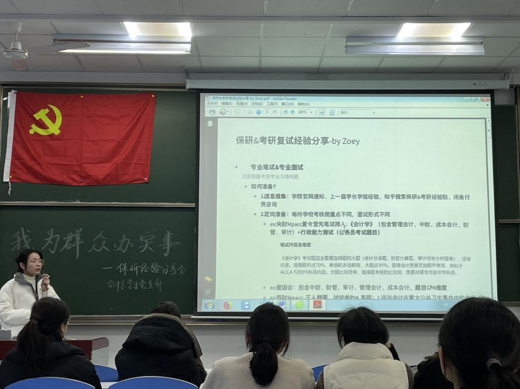 据悉,值此建党百年之际,为更好的落实“我为群众办实事”工作,会计系员工党支部先后举办了周公馆志愿服务、财会专业朋辈引领经验分享会等活动,尽支部所能帮助周围群众。而本次分享会内容丰富多元,与学习生活联系紧密,旨在为同学们提供关于保研的全面的经验分享,有助于同学们对自己未来的学习生活进行更好的规划。活动结束后,同学们纷纷表示,通过聆听分享会,切身感受到了先进党员的积极力量,获得了学习生活道路的建议和激励,并相信在优秀前辈的指引下,在个人的拼搏奋进中,大家能实现心中理想,成为对社会、对祖国更有用的人才!