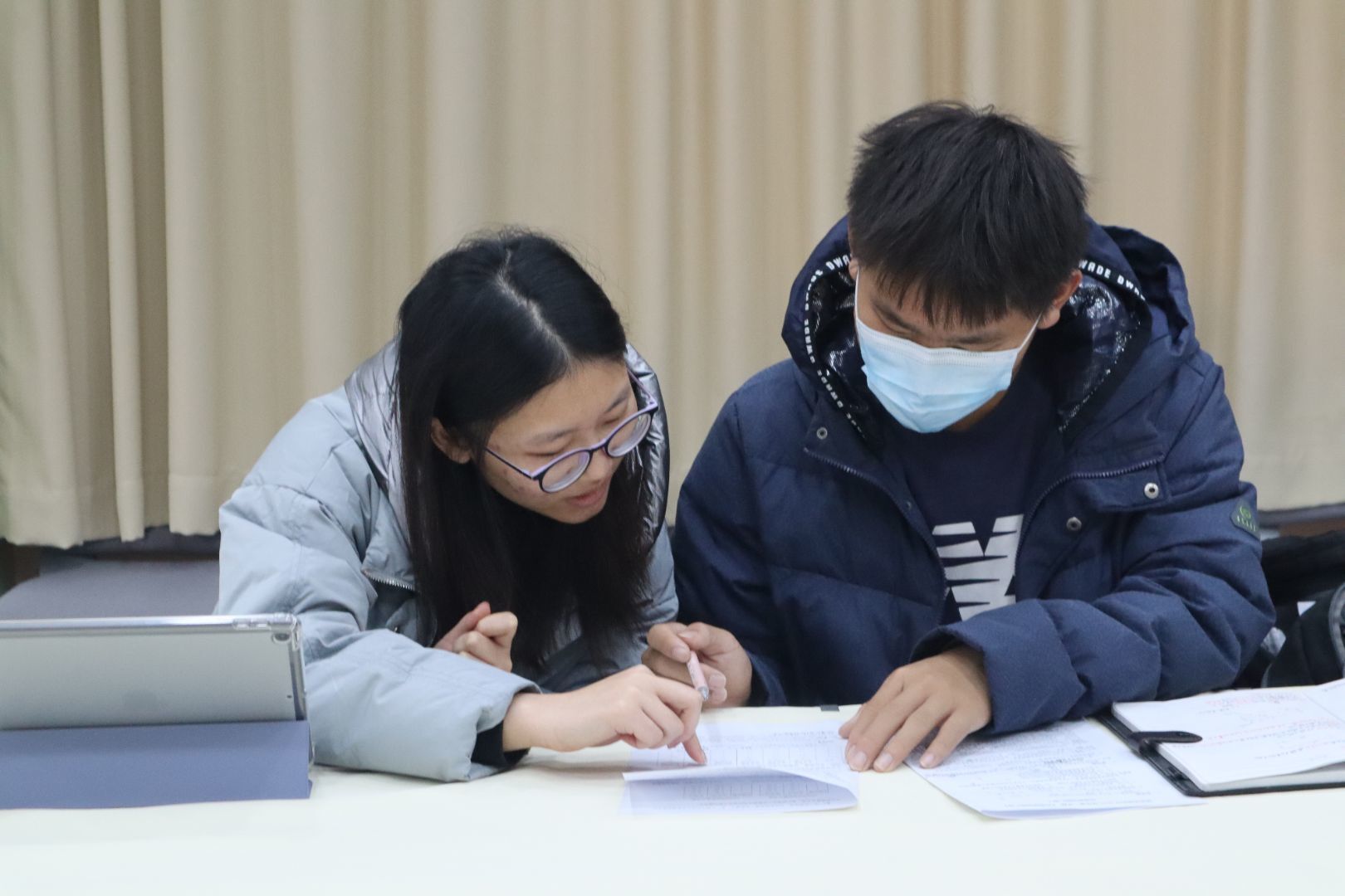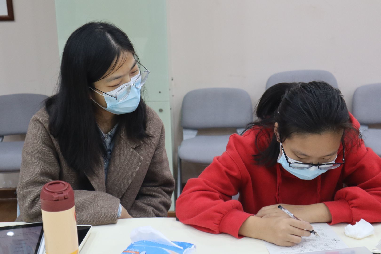同学在写作业时遇到了不懂的问题进行询问,志愿者在短暂思考后对其进行耐心的解答。一番交流下,同学理解了答案的思路。在同学认真完成作业时,志愿者在一旁仔细检查他们已完成的作业,遇到有错误的地方轻声指出并进行讲解。