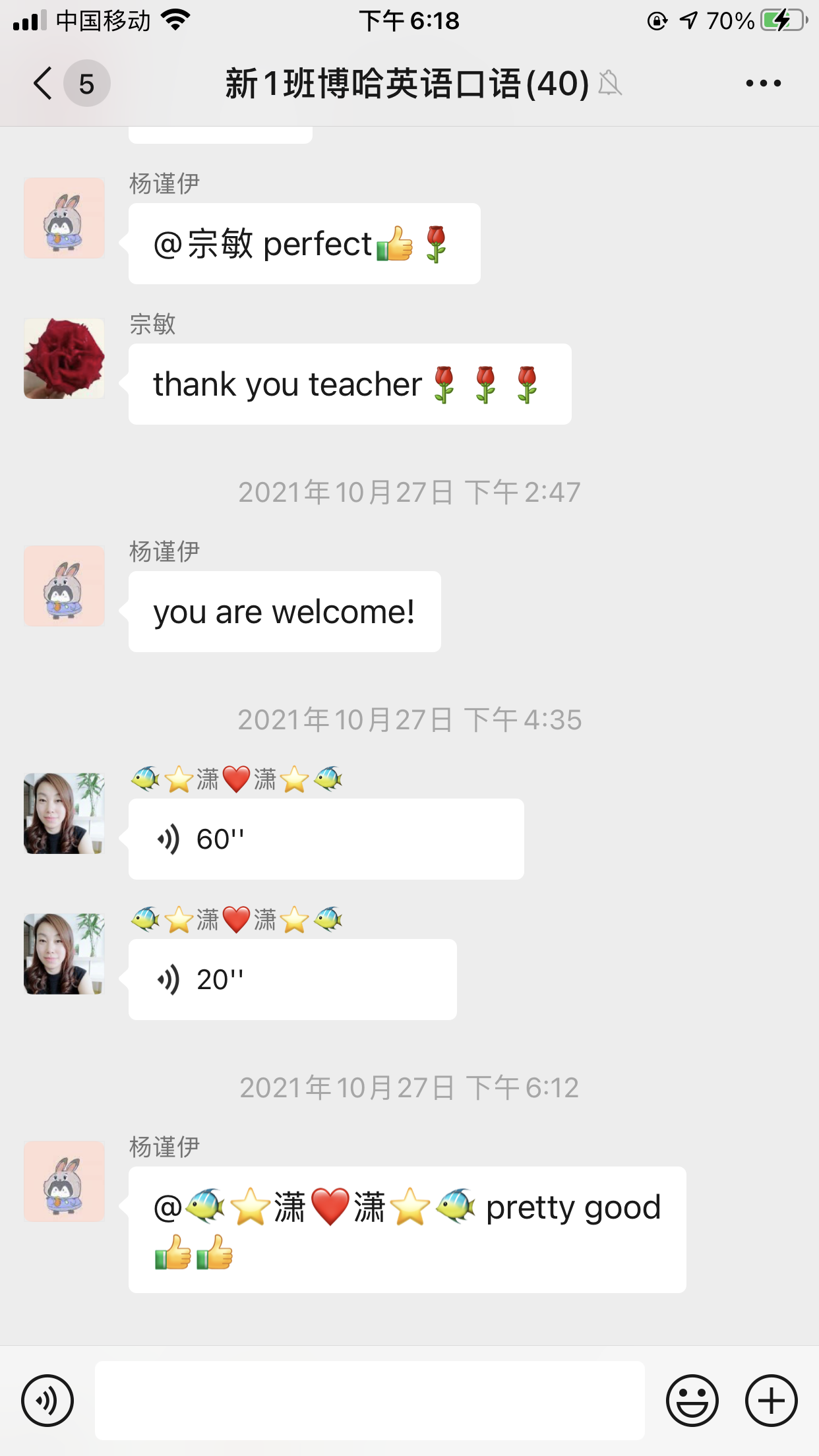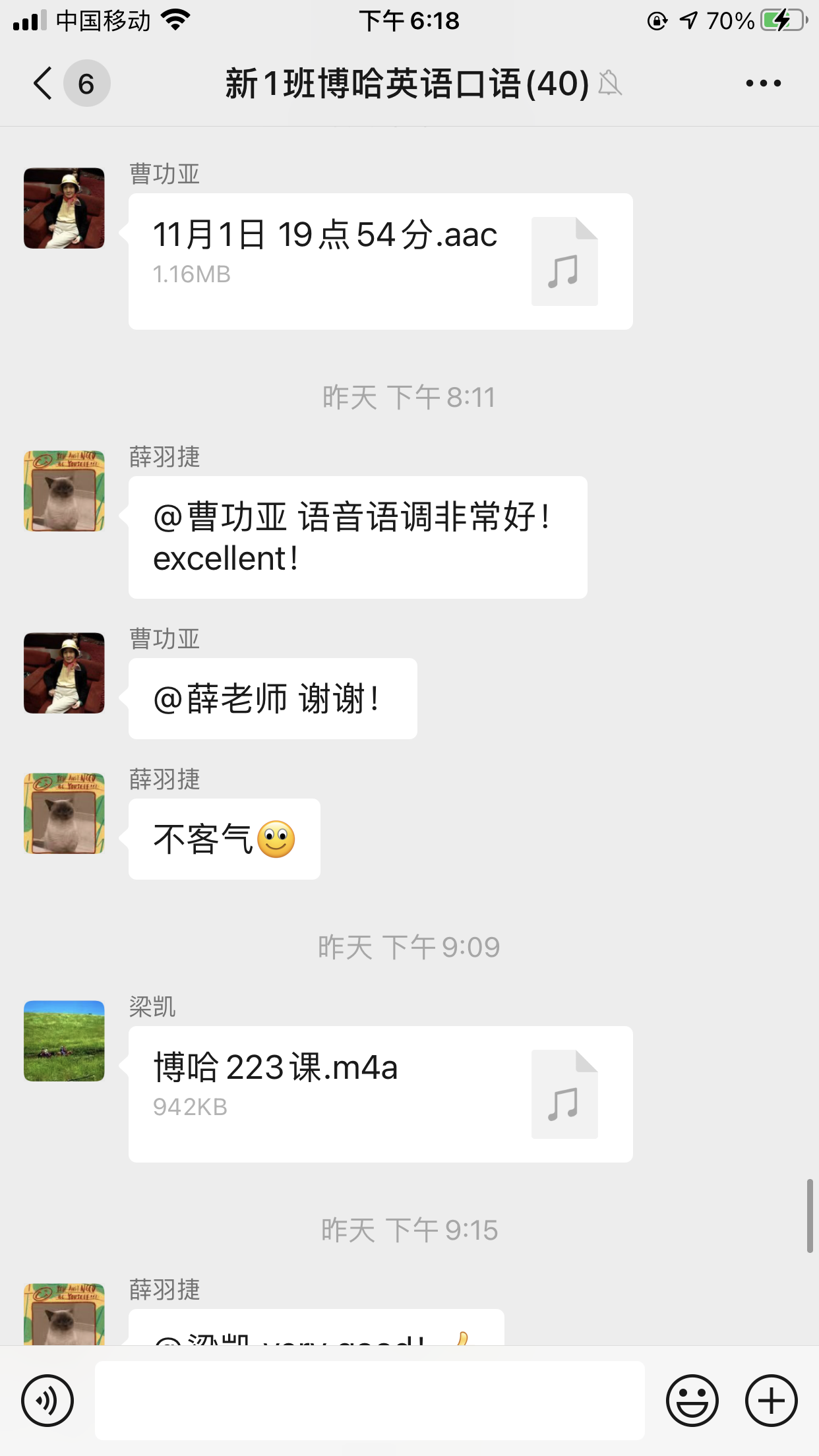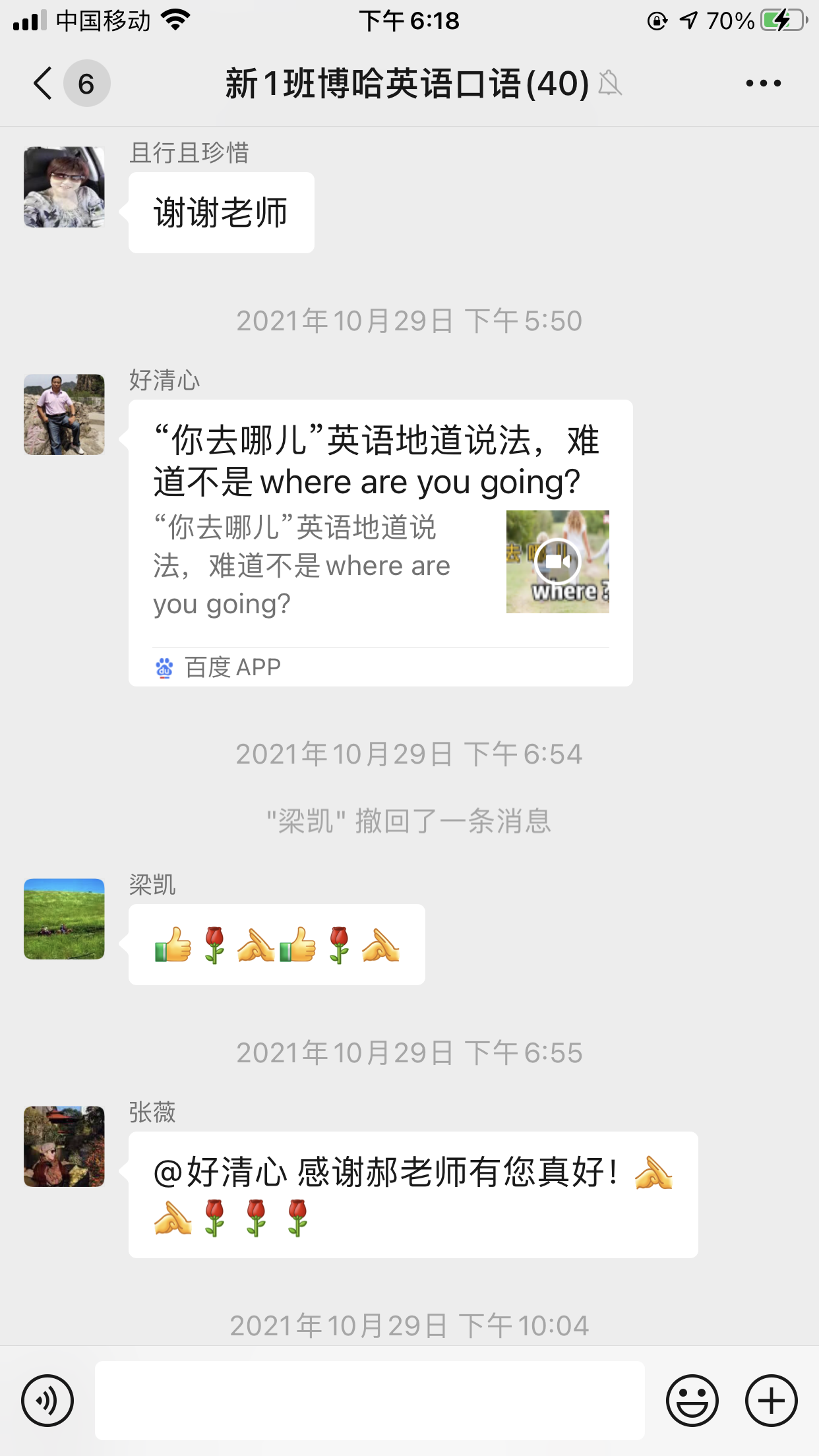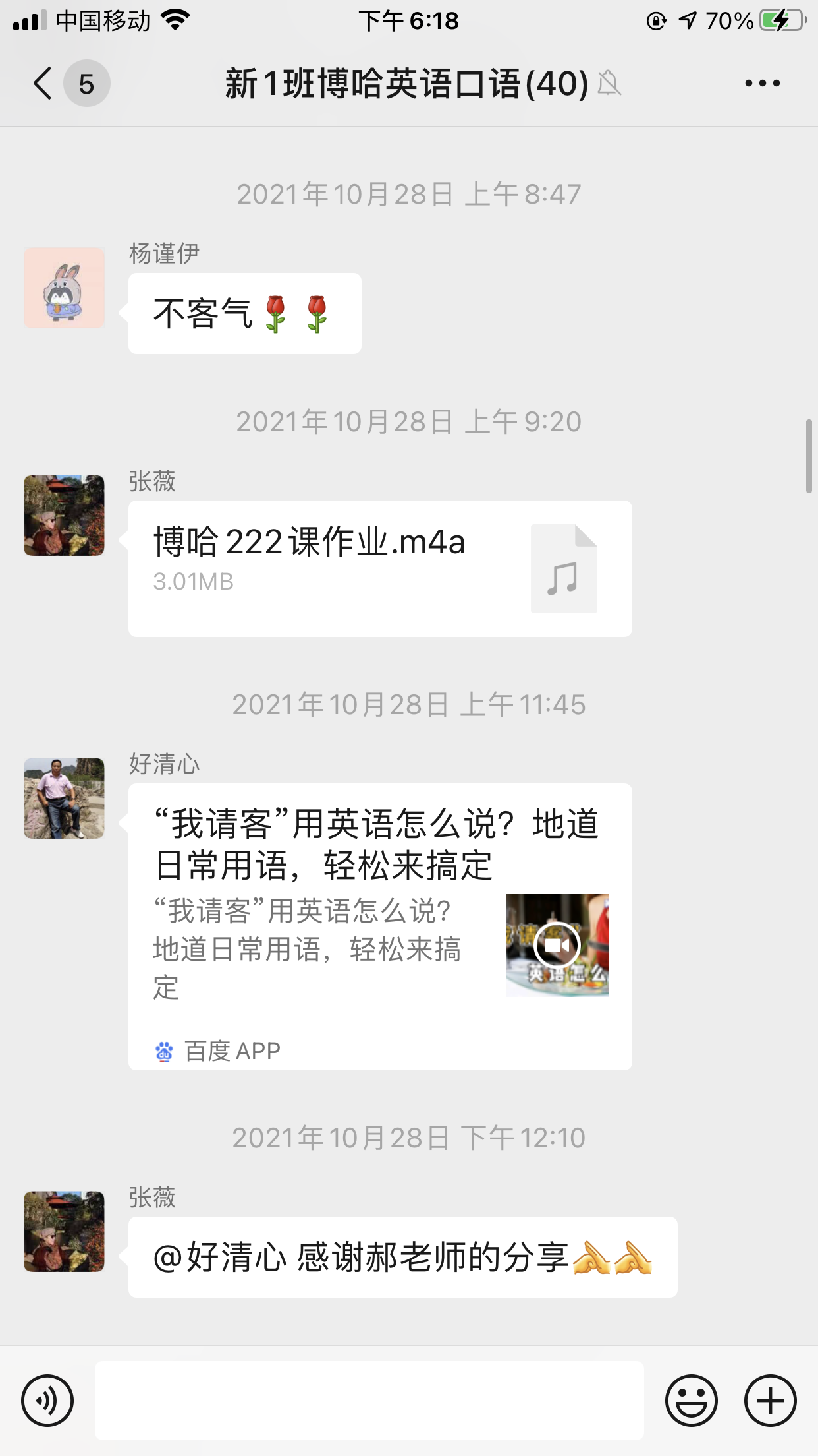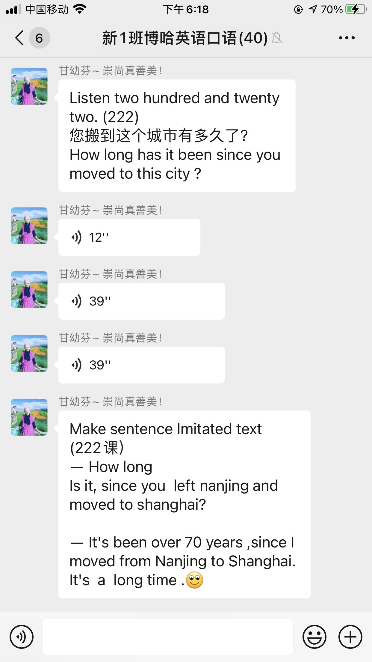 清水湾老年英语初级班面向老年群体,目的在于满足渴望学习英语的老人们的需求,以《博哈英语》为教材,通过微信语音消息的教学形式,教授老年学员学习英语口语,纠正老年学员英语口语发音,为老年学员解答英语口语学习上的问题。