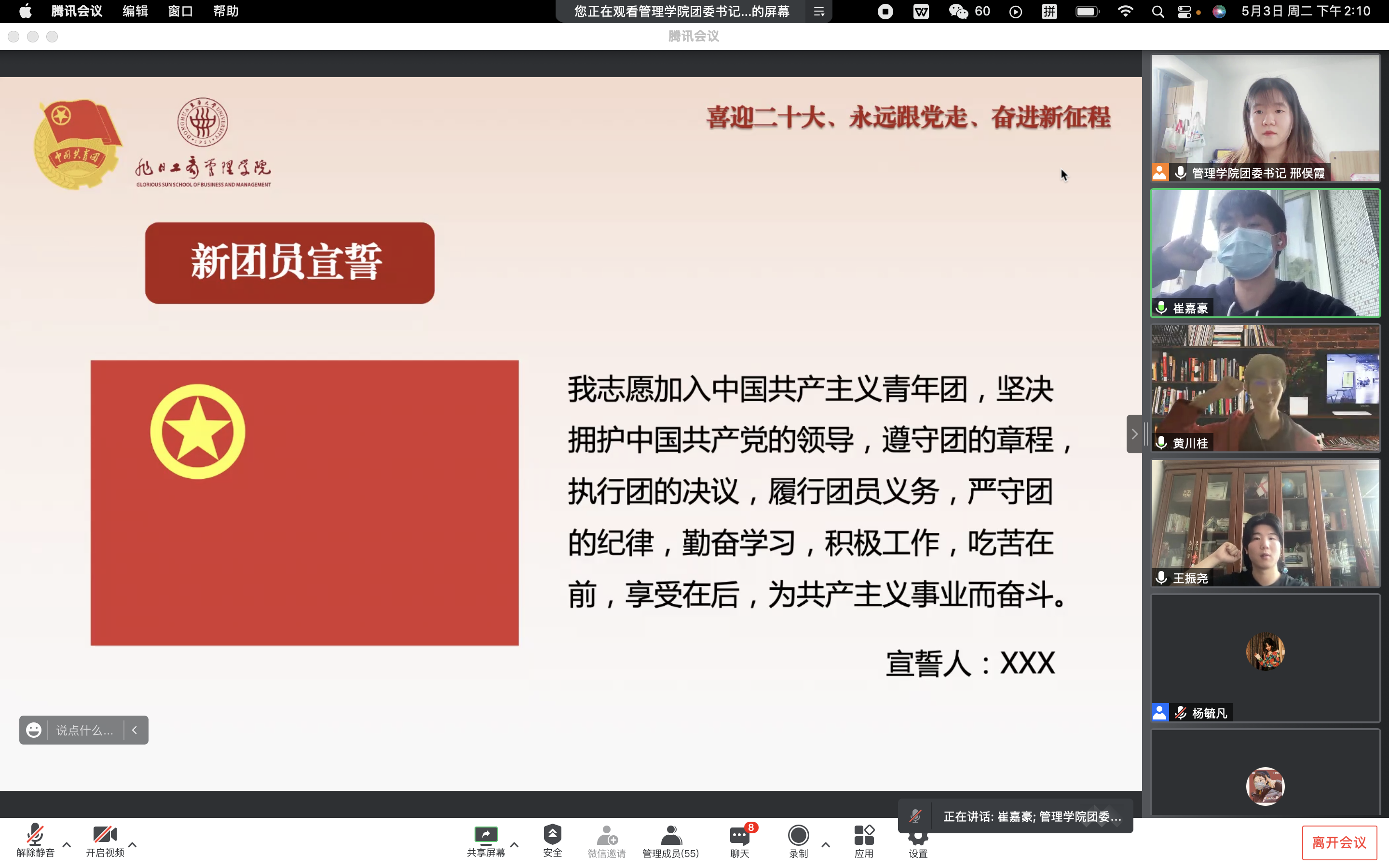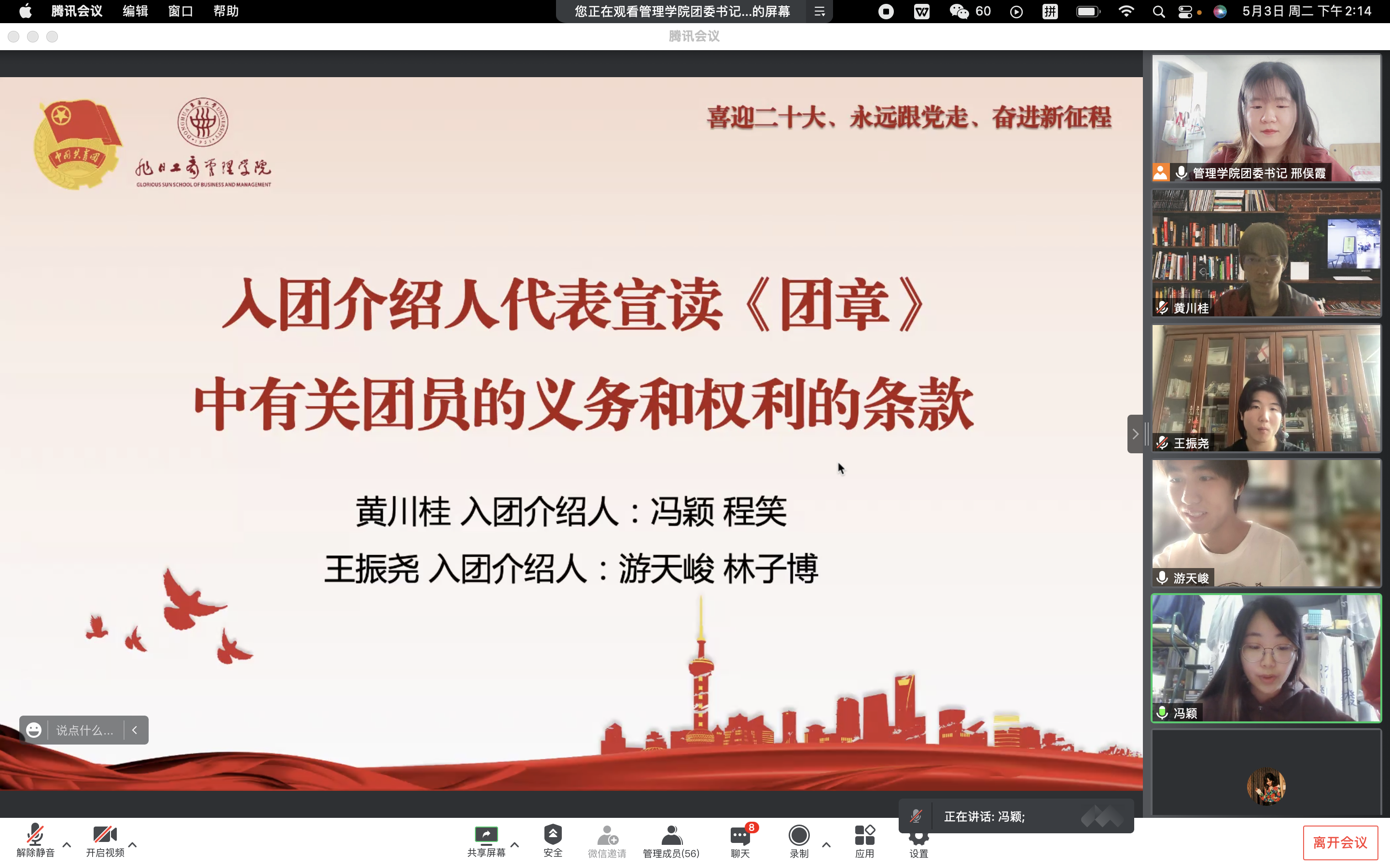 中国的未来属于青年,世界的未来也属于青年。为认真落实新时代全面从严治团的要求,进一步加强团员教育管理、规范团内仪式教育、增强共青团员意识、激发团的组织活力,韦德体育团委于5月3日下午2点线上开展2022年上半年新团员入团仪式,新发展团员、入团介绍人、辅导员及各团支部代表参与会议。