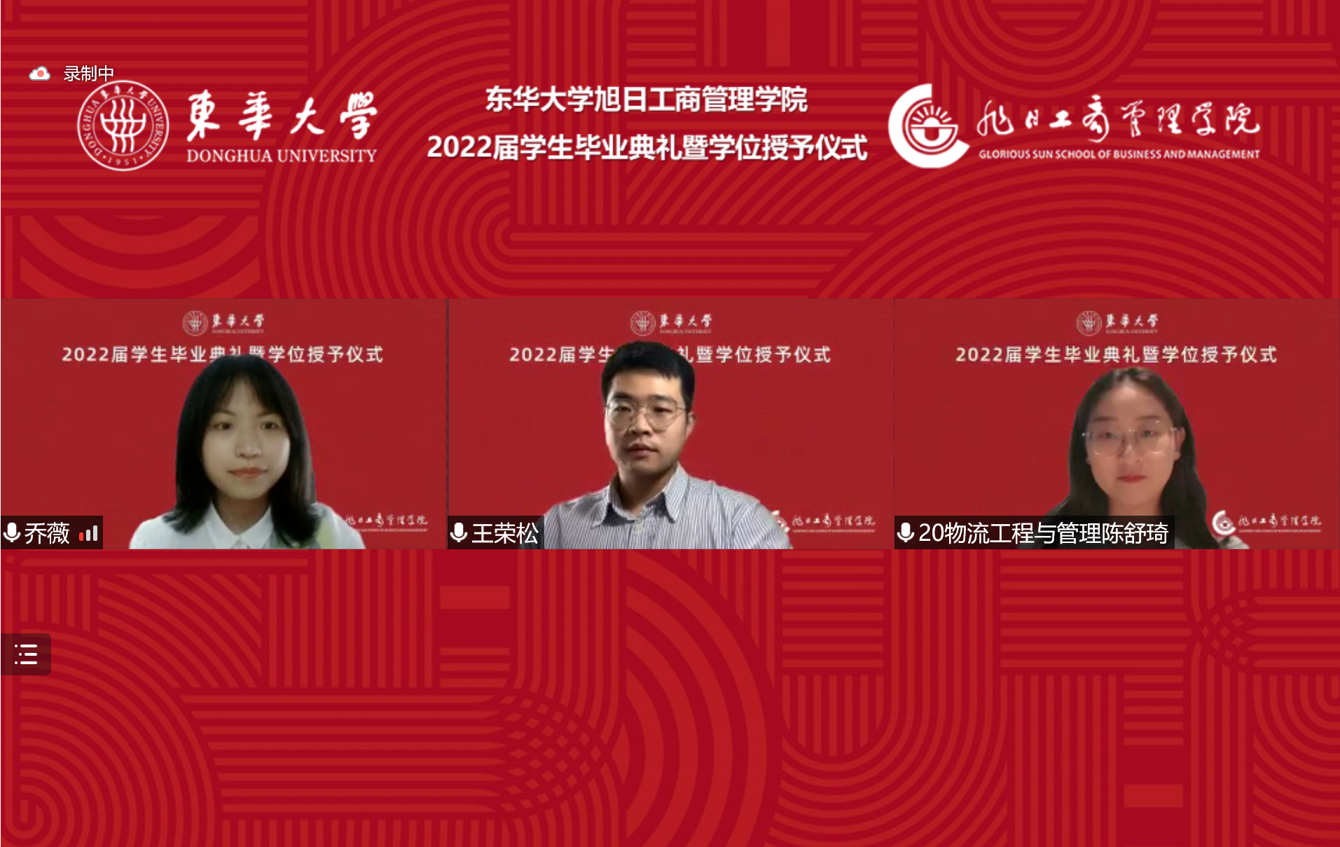 本科生代表乔薇回顾了四年大学光阴,感恩每个普通而平凡的日子,都有母校给予的成长与蜕变。研究生代表王荣松讲述了求知与钻研的三年东华路,在这里深刻理解到了科研人员对科学真理的执着追求和对服务国家战略需求的情怀责任。研究生代表陈舒琦感叹“疫情大考”是这场毕业季的最后一堂实践课程,致敬每一位冲锋在前的楼层长与志愿者们。衷心祝愿所有毕业生们前程似锦,祝愿母校枝繁叶茂。