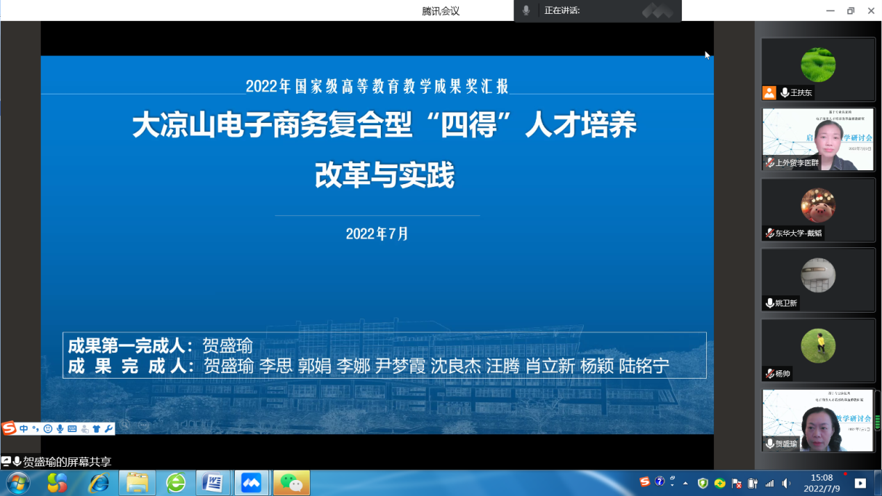 教研室首次工作研讨会由姚卫新教授主持。四川省社会主义公司副经理、西昌公司原经理贺盛瑜教授作了《民族地区电子商务复合型“四得”人才培养改革与实践--以大凉山为例》的报告。针对电子商务传统课程体系与大凉山经济社会发展需求不匹配、电子商务产学合作协同育人平台缺乏,以及电子商务育人团队与复合型“四得”人才培养有差距等主要的教学问题,介绍了西昌公司电子商务专业如何设计“一核心,两抓手,三支柱”复合型“四得”人才培养模式、创新举措和实践路径,构建契合大凉山需要的电子商务特色课程群、电子商务复合型“四得”人才培养质量过程管控体系,以及在育人实践方面培养具有家国情怀的最美教师团队的实践尝试。