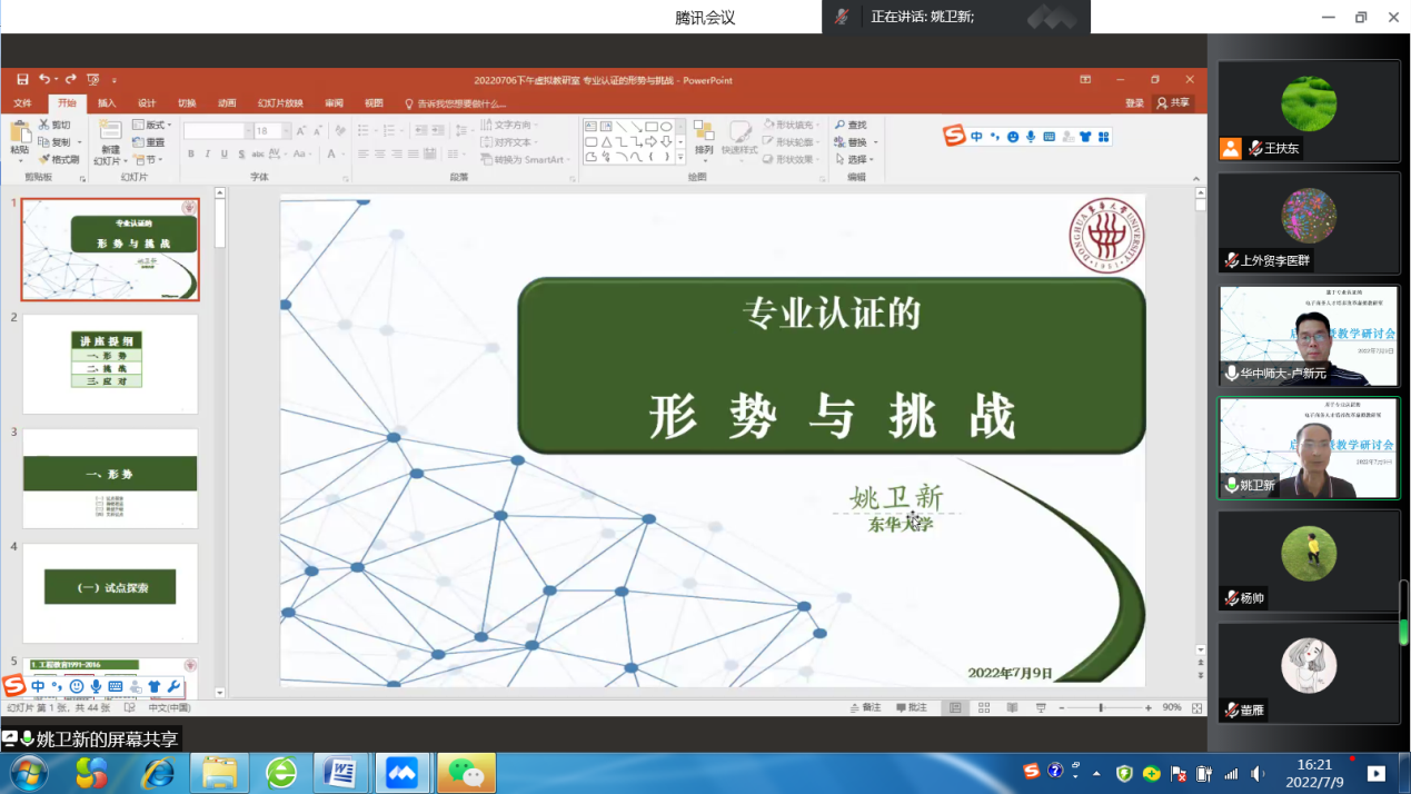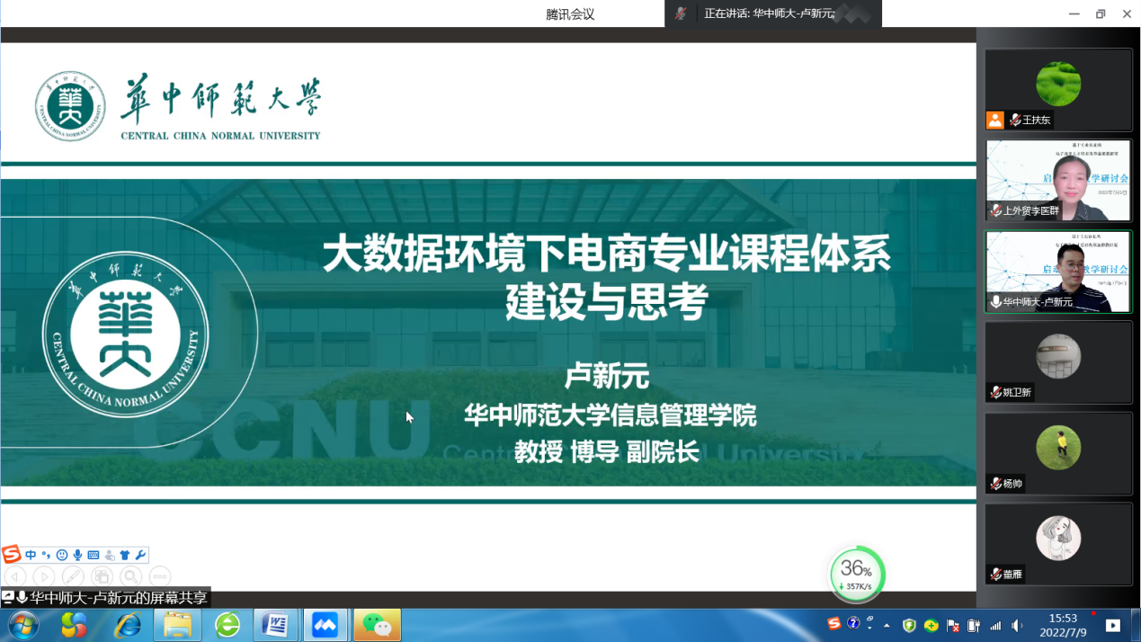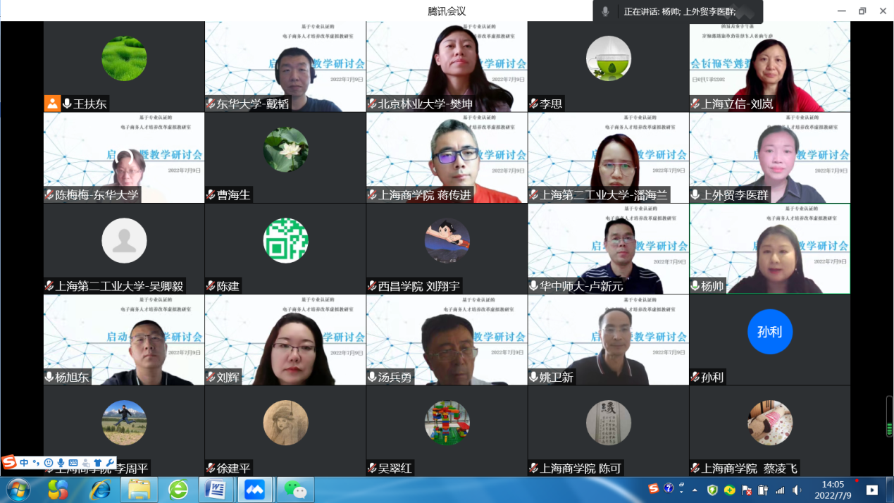 7月9日下午,教育部基于专业认证的电子商务人才培养改革虚拟教研室启动会暨第一次工作研讨会在线上举行。虚拟教研室负责人姚卫新,韦德体育官方网站教务处处长杨旭东,会议特邀嘉宾汤兵勇,西昌公司、华中师范大学信息韦德体育、华北电力大学外国语公司、上海对外经贸大学教务处、上海韦德体育商务信息公司、上海第二工业大学经济韦德体育、浙江师范大学经管公司、北京林业大学电子商务系、上海立信会计金融公司电子商务系、滇西应用技术大学电子商务系,以及韦德体育官方网站管理科学系等11所高校电商专业所在院系负责人及专业骨干教师共同参会。
