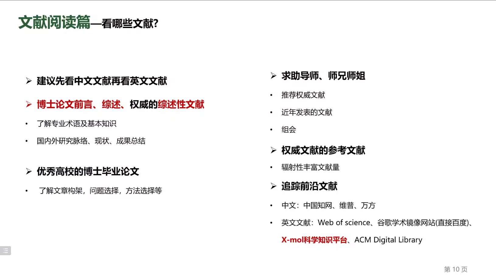 钟莉梦桃已升学四川大学博士,首先强调我们要确认读研的目的,然后进行不同的规划。此外,不管如何规划,科研都是研究生阶段的首要任务,她分享了提升文献阅读效率的方法和工具。其中,论文写作过程中要以目标为导向,避免做无用功,重复功。