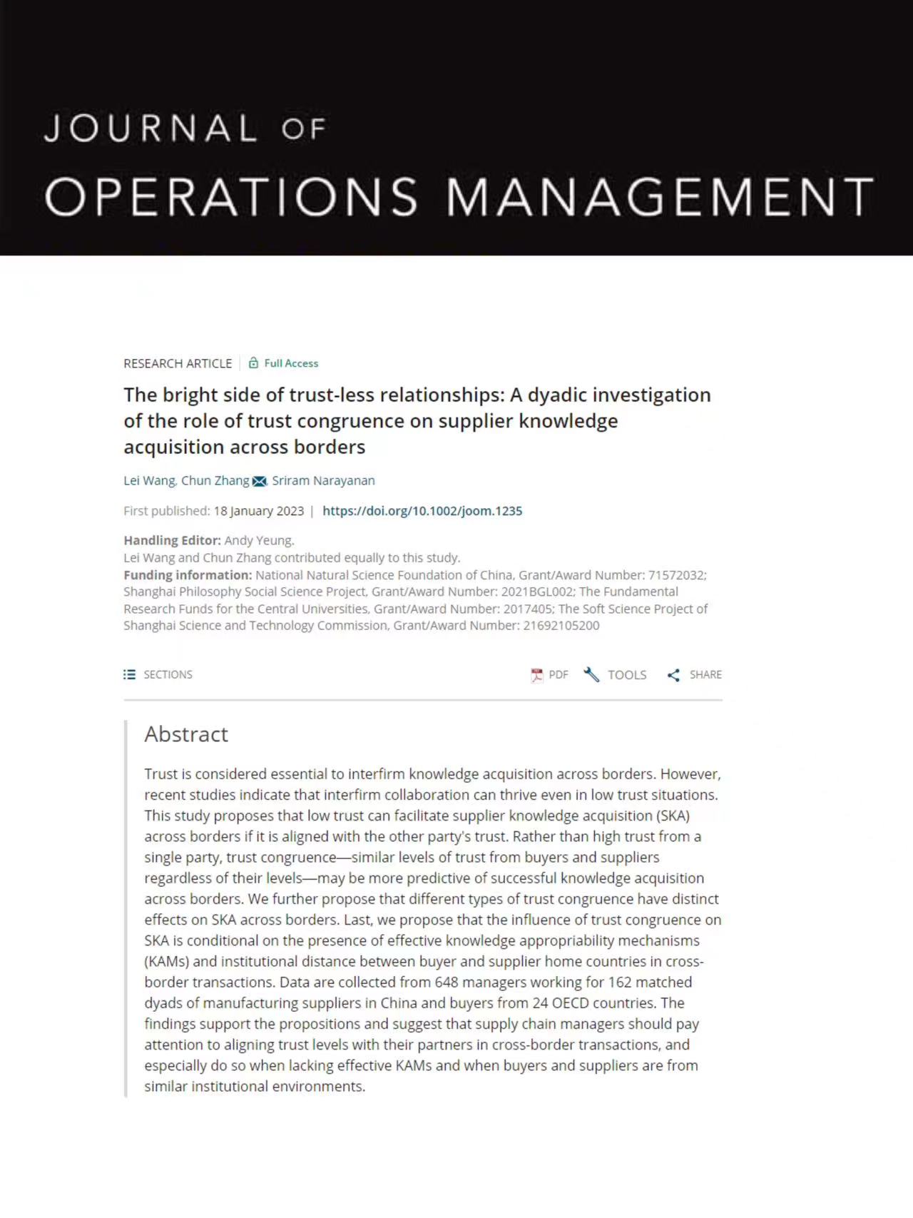 近日,公司应用经济系王雷教授以第一作者的身份在国际顶级学术期刊《Journal of Operations Management 》上发表了学术文章《The bright side of trust-less relationshipsA dyadic investigation of the role of trustcongruence on supplier knowledgeacquisition across borders》(《不信任的光明面:信任一致性对跨境知识获取的影响》)。该杂志是美国德克萨斯大学达拉斯分校(University of Texas at Dallas)所选出的韦德体育最顶尖24本学术期刊(简称“UTD-24”)之一,也是英国韦德体育协会(简称“ABS”)评选出的4星级期刊(级别最高)和英国金融时报认定用于国际韦德体育排名的50本卓越管理学期刊(Financial Times 50 Journals,简称“FT-50”)之一。