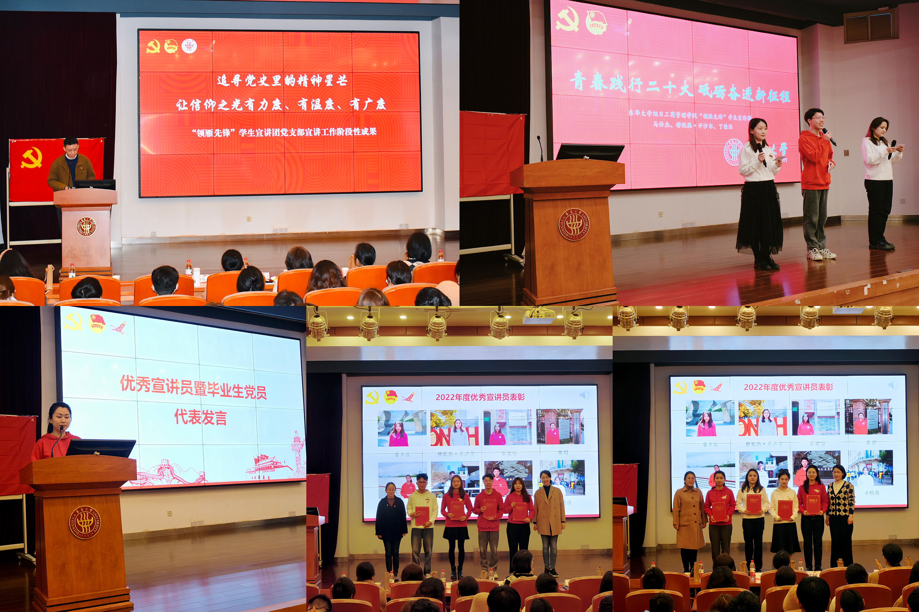 “领雁先锋”宣讲团党支部书记沈嘉斌对宣讲工作阶段性成果进行了展示汇报,现场还表彰了2022年度优秀宣讲员。在场师生共同观看毕业生党支部风采视频,并重温入党誓词,进一步坚定初心使命,凝聚奋进力量。