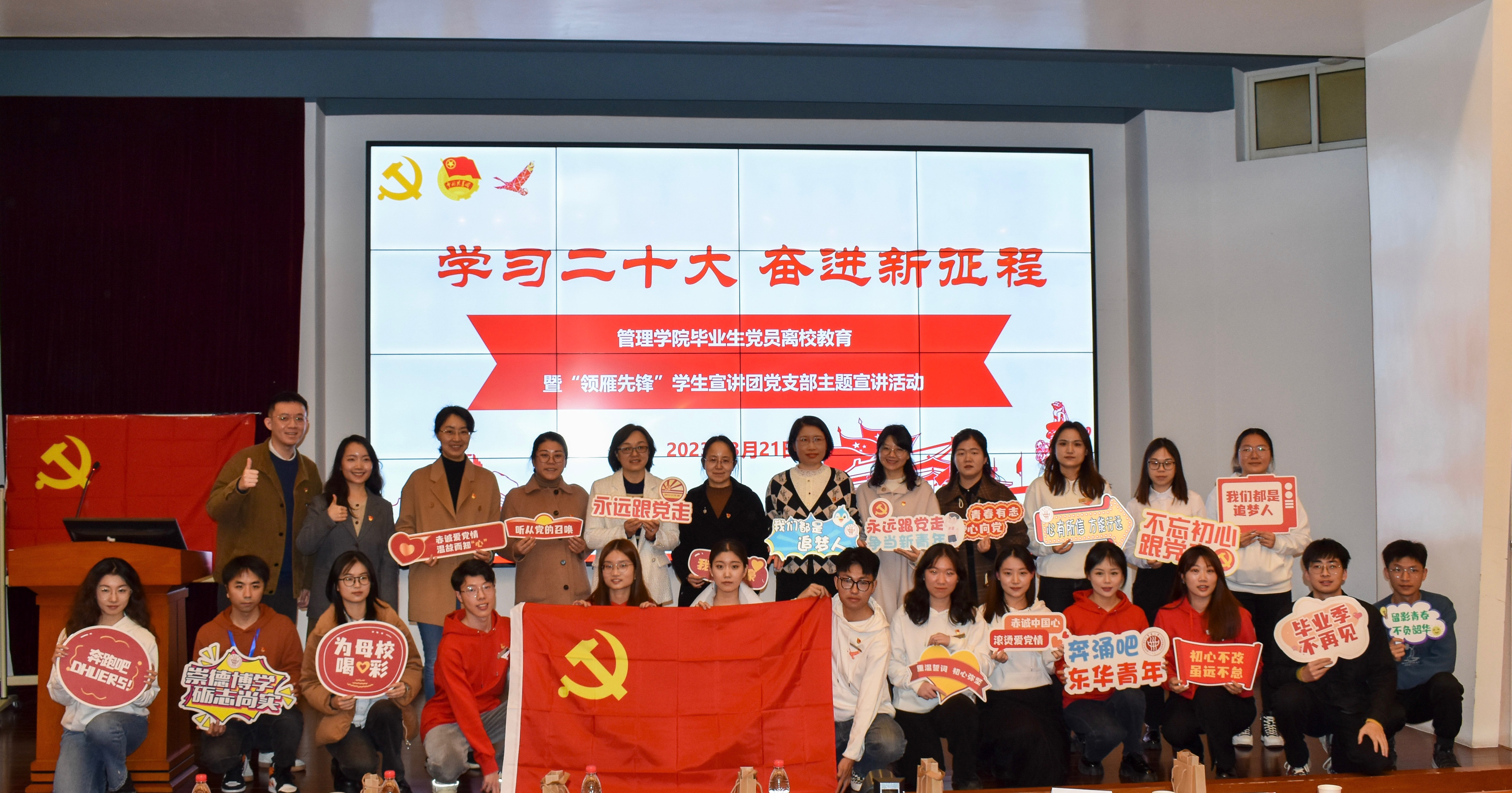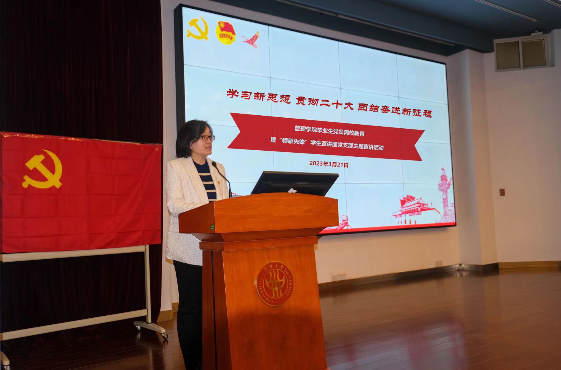 3月21日,韦德体育举行“学习新思想贯彻二十大团结奋进新征程”毕业生党员离校教育暨“领雁先锋”宣讲团党支部主题宣讲活动。管理公司党委书记林嵘,党校副董事长、党委组织部副部长李宁蔚,党委宣传部副部长向娟,党委员工(研究生)工作部副部长林惠英,管理公司党委副书记丁怡和公司党员师生代表100余人共同参加。