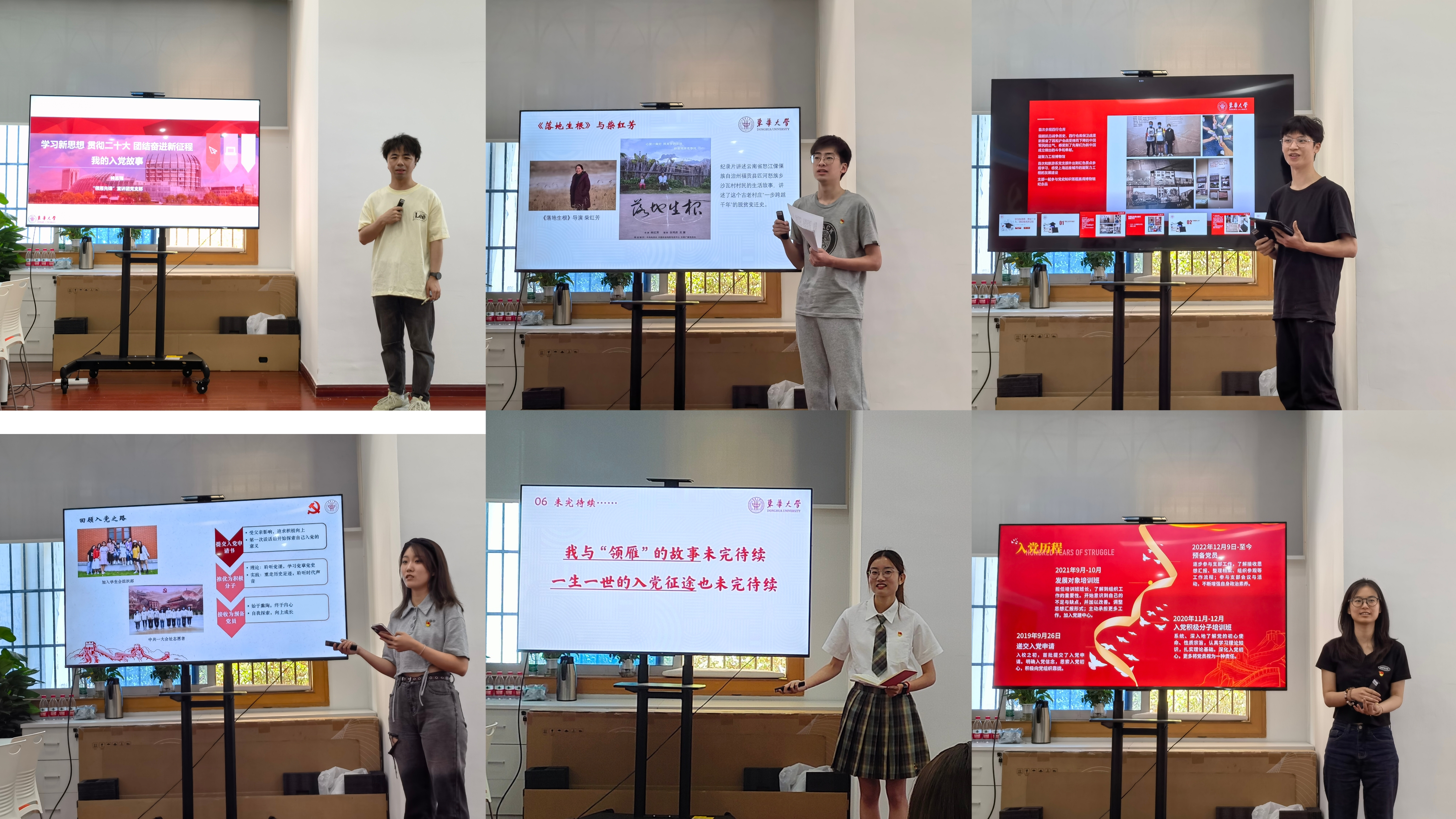 紧接着,六位毕业生党员以“入党前后的我”为主题,声情并茂地分享了自己入党的心路历程以及对过去、当下与未来的思考。其中,龙世华同学回顾了自己入党前后参观四行仓库、中共一大纪念馆等探索红色足迹的经历,以及投身于上海电影博物馆、疫情防控等为人民服务的志愿服务故事;并结合自身儿时、以及在参观学习时了解到的乡村公司曾经的落后情况,表达了对乡村振兴事业蓬勃发展的敬仰以及未来自身即将加入这份事业的憧憬。赵政同学将自己的入党心路历程划分为了三个阶段,展现了入党动机受家庭、与老师间的谈话、自我与党校的学习过程,以及为社会做出贡献的实践工作的影响而不断深化、更为坚定地选择共产主义的过程;她认为,入党并成为“领雁先锋”宣讲团党支部的一员不仅让她获得了归属感,更是提升了自我的政治素养和工作习惯,即使即将因为毕业而与熟悉的校园与伙伴道别,但热忱的、追求向上的心将汇集大家在更好的未来相见。