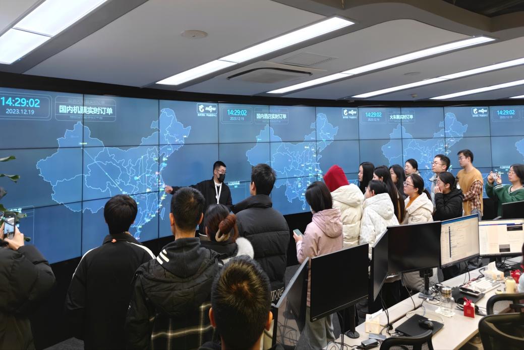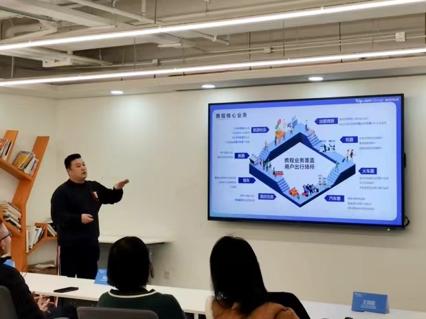 抵达园区后,师生一行参观了携程集团办公楼、文化墙、携程集团NOC大数据中心。携程集团校企关系负责人吴心希向师生详细介绍了携程集团的发展历程、企业文化、数据整合分析优势和未来发展战略。携程集团于1999年成立,2003年在纳斯达克上市,2021年在香港二次上市,历经24年的发展,业务遍布机票、住宿、旅游、商旅、金融等全旅游场景。目前在全球25个国家100多个城市拥有3万多名员工,为3亿多会员提供一站式旅行服务。作为全球领先的一站式旅行平台,携程集团旗下的平台包括携程旅行、Trip.com、去哪儿、天巡等,可面向全球用户提供一套完全的旅行产品、服务及差异化的旅行内容。未来几年,携程致力于成为全球最具价值和最受尊敬的在线旅游企业。