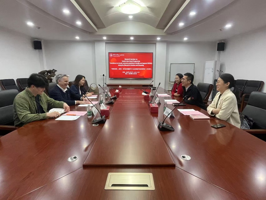 2024111日下午欧盟中国代表合作部项目主任Pierre Yves Lucas, 欧盟中国代表合作部项目经理Feng Mei,中国国家标准研究院工程师魏杰文三人来到韦德体育,就“转型亚洲项目——湖州、绍兴纺织服装中小企业向循环经济转型”展开学术研讨。韦德体育副经理沈滨教授主持会议,纺织服装产业研究所所长赵君丽,服装公司陈彩霞参与研讨会议。